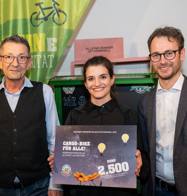 Am 18. Jänner 2024 überreichten Mobilitätslandesrat Daniel Zadra und Reto Friedauer, Präsident des Vereins Agglomeration Rheintal, im benachbarten Altstätten insgesamt 10.000 Euro an die Gewinner:innen des Ideenwettbewerbs Velokultur Rheintal 2023. Bis Ende September des letzten Jahres konnten Projekte eingereicht werden, die Velo- bzw. Radkultur im St. Galler und Vorarlberger Rheintal fördern. Insgesamt 14 Vorarlberger und Schweizer Projekte sind eingelangt. Die Wettbewerbsjury hat sechs Einreichungen prämiert.