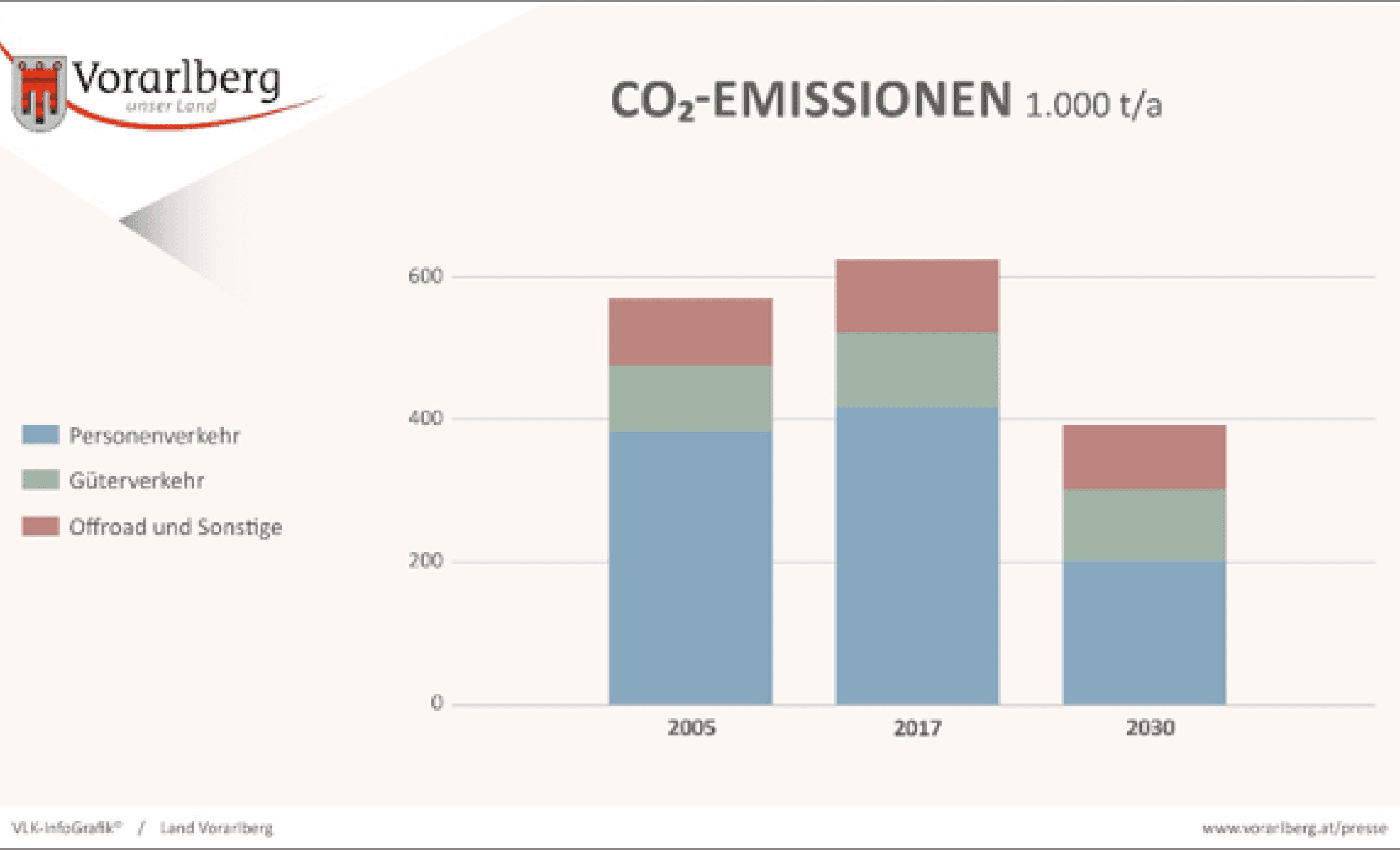 Im Sektor Mobilität hat sich Vorarlberg ein ehrgeiziges Ziel gesetzt. 2030 soll die Verteilung der Verkehrsmittelwahl der Vorarlberger Bevölkerung wie folgt aussehen: