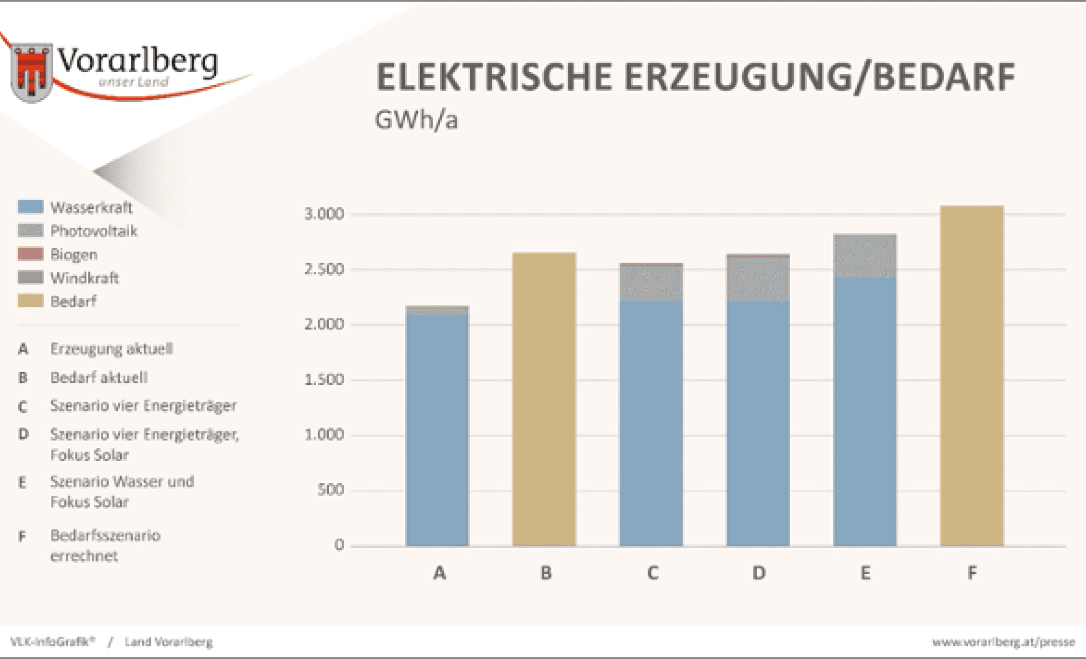Den Verbrauchssektoren gegenüber steht der Ausbau der regionalen erneuerbaren Energieträger. Die Stärkung der heimischen Wasserkraft ist dabei weiterhin möglich und nötig. 13 neue Standorte können bis 2030 vermutlich erschlossen oder zumindest in ihrer Effizienz gesteigert werden. Zudem sind zwei Standorte für Großkraftwerke verfügbar. Bei der Photovoltaik plant die Landesregierung den jährlichen Ausbau zu verdreifachen. Das technische Potential hierfür ist gegeben, zeigt die Studie. Auch das Energieholz wird in seiner Bedeutung steigen. Damit könnte die derzeitige Nutzung von Biomasse in Wärmeanwendungen in Vorarlberg verdoppelt werden.