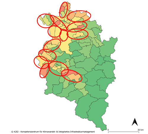 Potentialverteilung in kWh pro Hektar nach Gemeinden (je intensiver die Rottönung desto höher das Potential) und mögliche Biogascluster, bzw. Gebiete für gemeinsame Anlagen innerhalb einer wirtschaftlichen Distanz.