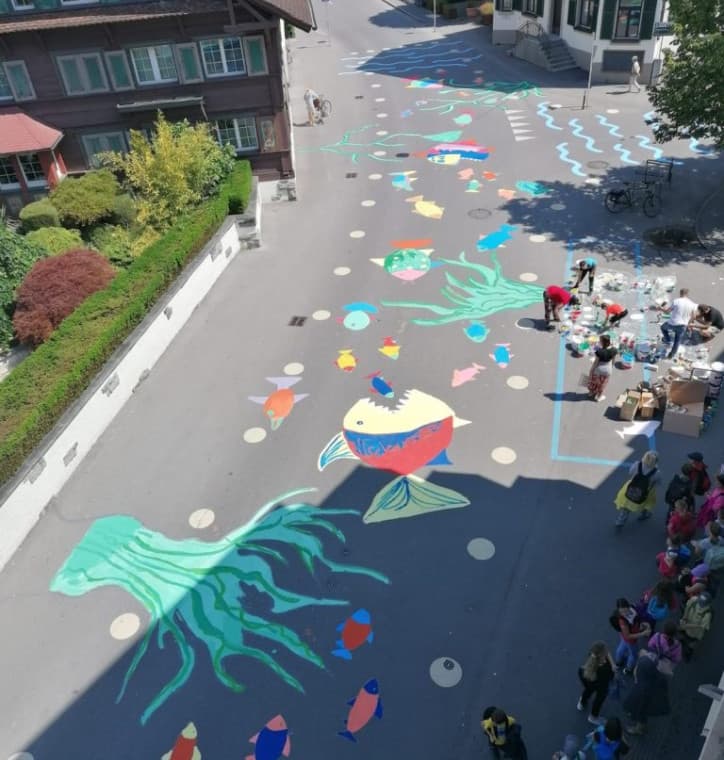 Unter dem Motto „Kinder, lasst die Straßen blühen“ wurden die grauen Straßen mit bunten Malereien geschmückt. Dass der Straßenraum nicht nur Verkehrsfläche für Autos, sondern auch Bewegungsraum und Schulweg für Kinder ist, zeigen nicht nur Blumen, sondern auch gemalte Unterwasserlandschaften, Tierbilder und Fantasiefiguren.
