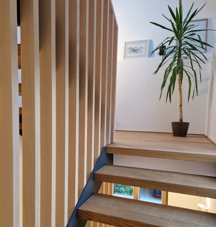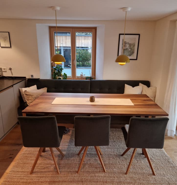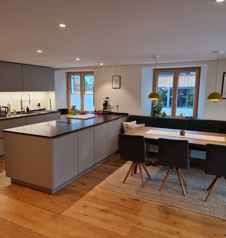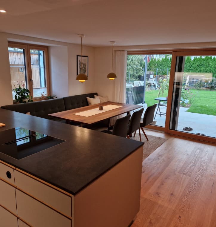 Im Frühjahr 2023 wurde mit dem Umbau begonnen – davor musste viel ausgeräumt und ein grober Abbruch gemacht werden. Dann ging es richtig los: neue dreifachverglaste Fenster, Dämmung, eine neue Heizung und die gesamte Haustechnik. „Jede freie Minute war ich am Bau,“ erzählt der Bauherr. Er selbst hat kleinere Maurerarbeiten gemacht, verputzt und Handwerker:innen unterstützt. Und das mit viel Unterstützung des Vaters, der das Haus wie seine Westentasche kennt.