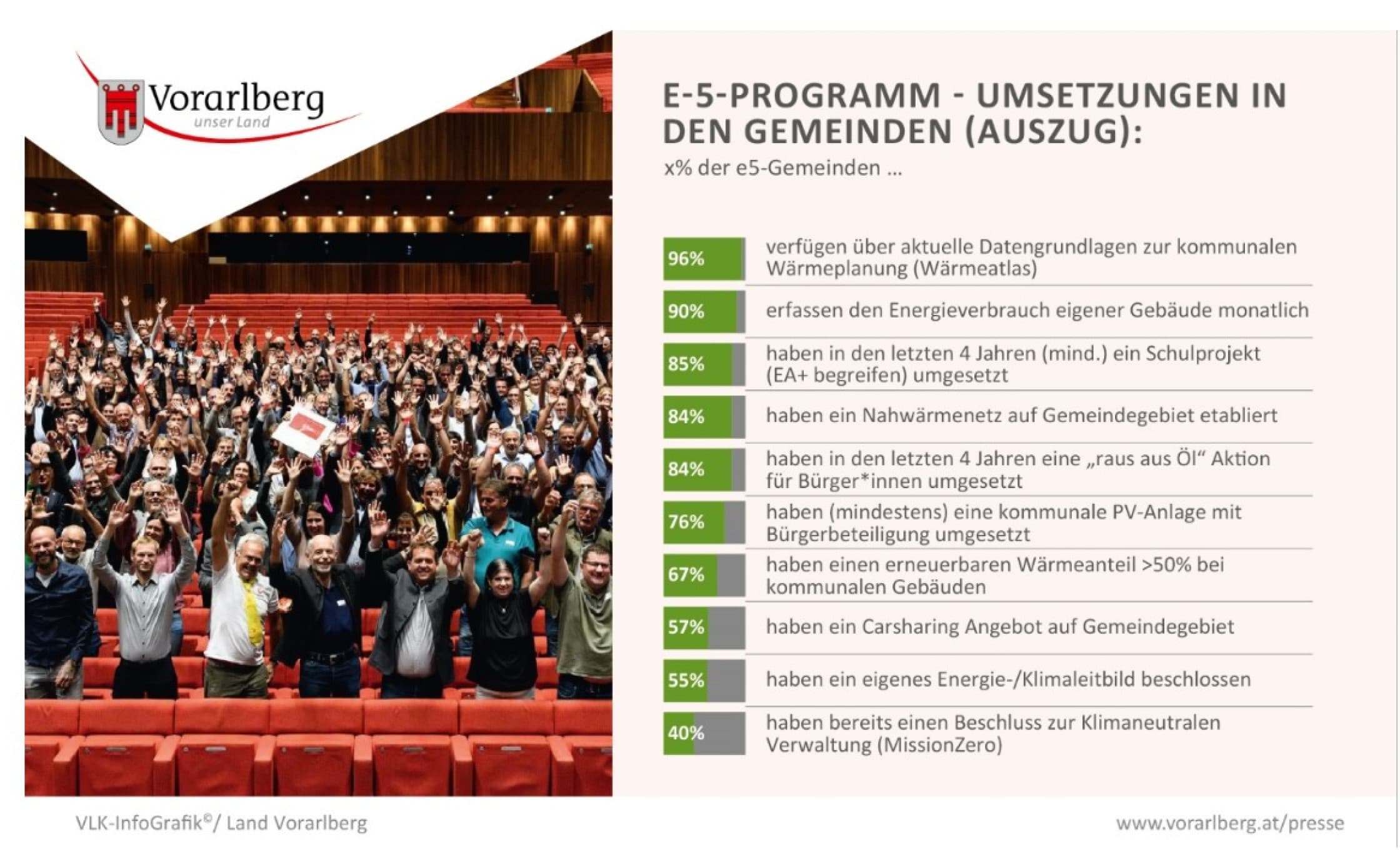 Standards über die Landesgrenzen hinaus setzen die e5-Gemeinden in der Umsetzung von nachhaltigen Gebäudesanierungen und kommunalen Neubauprojekten. Sie werden durch ein spezielles Service begleitet und vom Land Vorarlberg durch erhöhte Bedarfszuweisungen besonders unterstützt. Die dafür im Auftrag des Landes entwickelten Instrumente finden inzwischen auch in Deutschland Verbreitung. Hier sieht der Landeshauptmann die e5-Gemeinden in der Rolle der Vorbilder: „Die Gemeinden zeigen auf dem Weg zur Energieautonomie praxistaugliche und zukunftsfitte Lösungen und werden so zu Wegbereitern der Energieautonomie.“ Das Land Vorarlberg unterstützt das e5-Programm deshalb heuer mit 312.000 Euro.