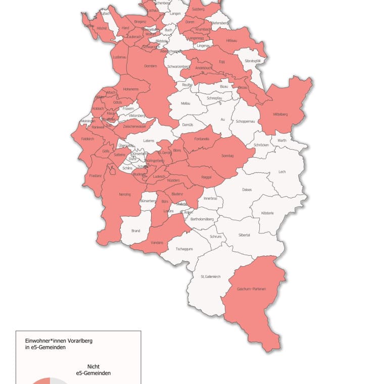 49 der 96 Vorarlberger Gemeinden sind Teil des e5-Programms für energieeffiziente Gemeinden. 86 Prozent der Vorarlberger Bevölkerung lebt in einer e5-Gemeinde. Hauptziele sind der sorgsame Umgang mit Energie, die Stärkung regionaler Energieträger und die Reduktion von Treibhausgasemissionen. „Das macht die e5-Gemeinden zu tragenden Säulen auf dem Weg zur Energieautonomie“, informieren Landeshauptmann Markus Wallner und Energielandesrat Daniel Allgäuer.
