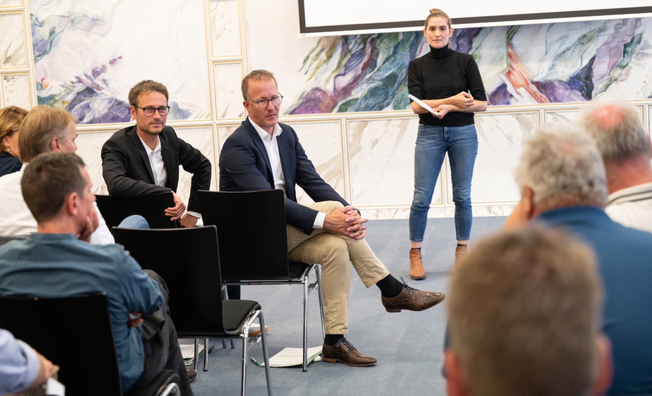 Landesräte Daniel Zadra und Christian Gantner sowie Gemeindeverbandspräsidentin Andrea Kaufmann diskutierten mit den Gemeinden über Energiesparmaßnahmen.