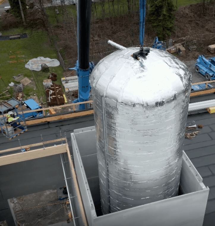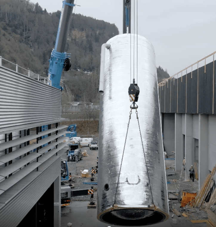Die Errichtung des Biomasseheizwerks der Nahwärme Weidach geht in großen Schritten weiter. Ende März wurde der 15 Meter lange und 46,5 Tonnen schwere Pufferspeicher in das Gebäude des Heizwerks eingehoben. Zuvor war der Speicher mittels Sondertransport von Hörbranz nach Bregenz geliefert worden.