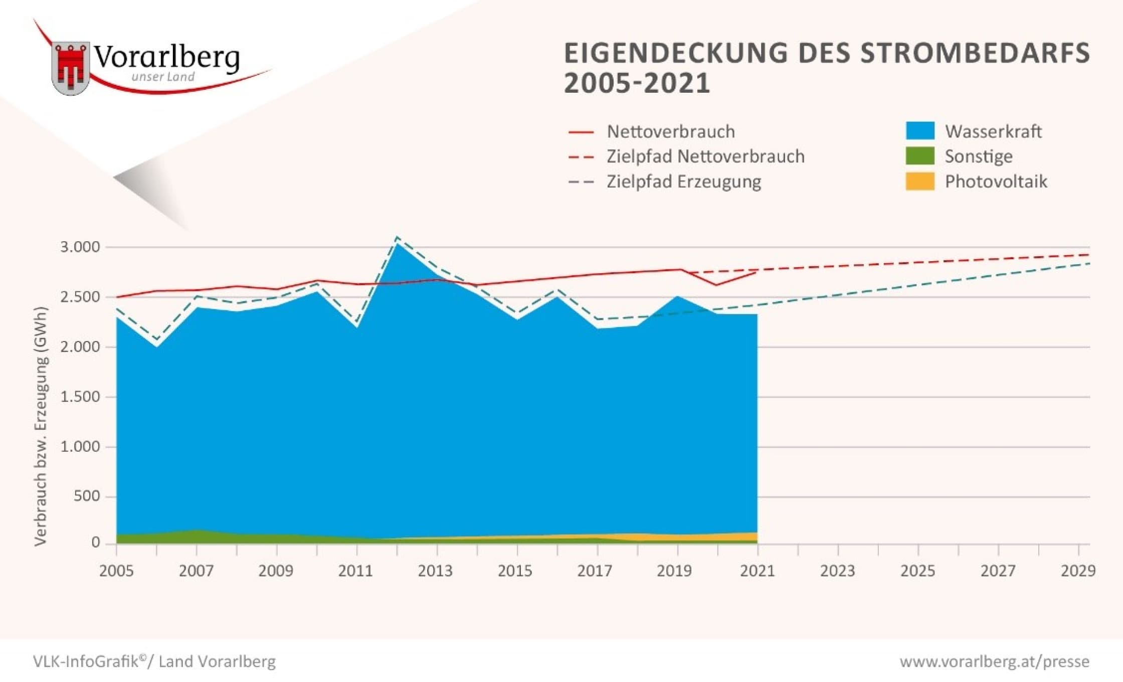 2021 wurden in Vorarlberg 2.808 GWh an elektrischer Energie an Endkund:innen abgegeben, um zwölf Prozent mehr als im Jahr 2005. Der Zuwachs fand vor allem in der Industrie statt (+22 Prozent). Rund 87 Prozent der Netzabgabe elektrischer Energie konnten aus heimischen Erzeugungsanlagen gedeckt werden, vor allem aus Wasserkraftanlagen. Dem Ziel einer zu 100 Prozent erneuerbaren Stromproduktion hat sich Vorarlberg bei gleichgebliebener Wasserkraftproduktion wie im Vorjahr durch einen Rekordausbau bei der Photovoltaik weiter angenähert. Der Zielwert für das Jahr 2021 wurde exakt erreicht.