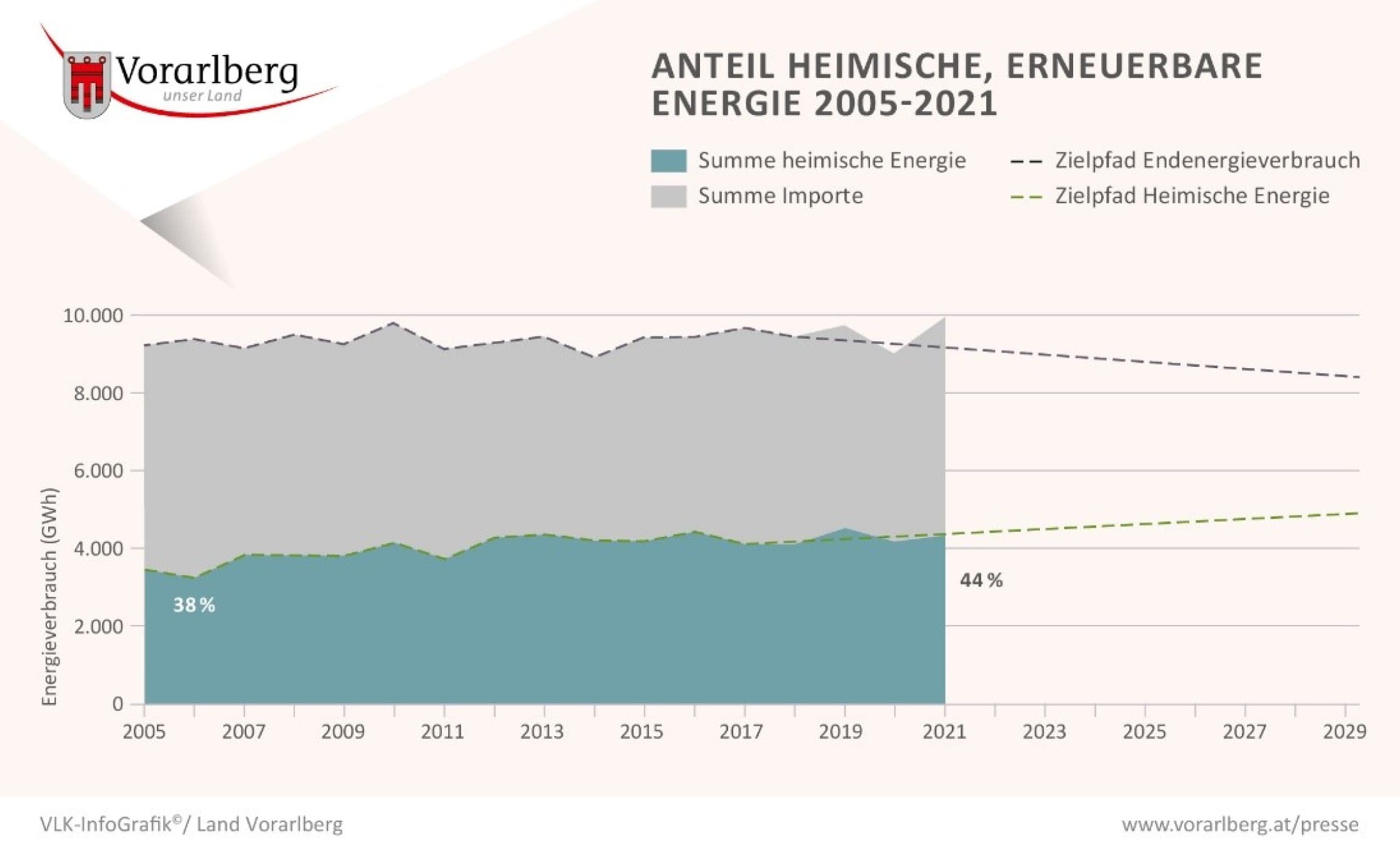 2021 wurden in Vorarlberg 9.966 GWh an Endenergie (exkl. Kraftstoffexport) verbraucht – um zehn Prozent mehr als im Jahr davor und um acht Prozent mehr als im Basisjahr 2005. Der größte Verbrauchsanteil entfiel auf den Sektor Gebäude (53 Prozent), gefolgt von Industrie (25 Prozent) und Verkehr (20 Prozent). Der Energieverbrauch konnte zu 44 Prozent aus heimischen Energiequellen gedeckt werden. Das Etappenziel von 47 Prozent wurde damit – wenn auch knapp – verfehlt. Bis 2030 sollen 50 Prozent der Energie aus heimischen (erneuerbaren) Energieträgern stammen.