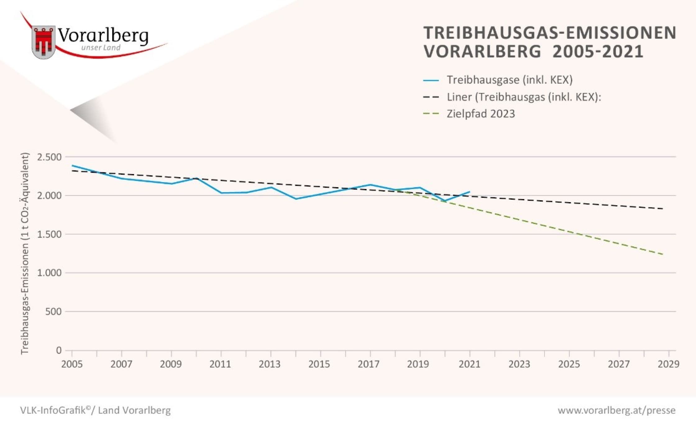 Die Treibhausgas-Emissionsmenge Vorarlbergs sank von 2005 bis 2021 um 13 Prozent auf rund 2,1 Millionen Tonnen CO2-Äquivalent. Doch von 2020 auf 2021 stiegen die Emissionen um 5,2 Prozent. Hauptverantwortlich dafür sind Zunahmen des fossilen Energieverbrauchs in den Sektoren Gebäude, Industrie und Verkehr. Das Ende des „Pandemie-Effekts“ zeigt sich damit auch bei den Treibhausgasen. In den Sektoren Energie, Abfallwirtschaft und Fluorierte Gase kam es in diesem Zeitraum zu Emissionsreduktionen. Die wesentlichen Verursacher von Treibhausgas-Emissionen waren die Sektoren Verkehr (43 Prozent), Gebäude (22 Prozent) und Industrie (17 Prozent). Die Emissions-Höchstmenge gemäß Zielpfad wurde um elf Prozent überschritten. Das Ziel bis 2030 besteht in der Halbierung des Treibhausgasausstoßes gegenüber 2005.