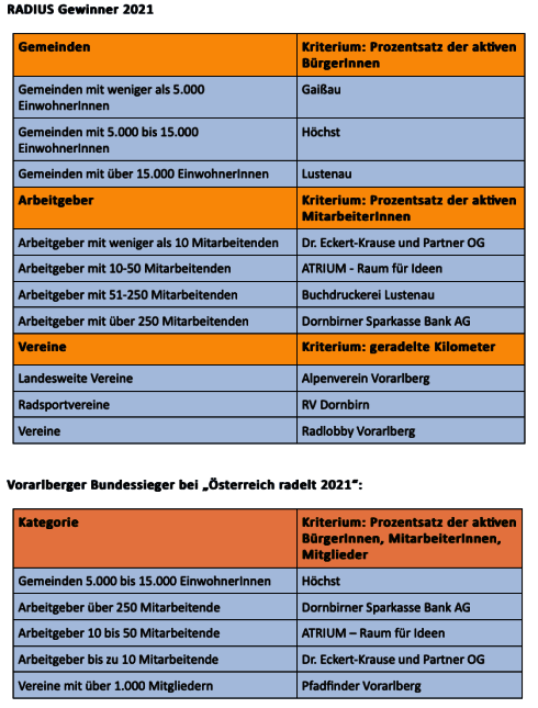 Gekürt wurden 2021 auch wieder die besten Gemeinden, Arbeitgeber und Vereine im Land. Kriterium für den Sieg war dabei der Prozentsatz an Mitarbeiter:innen bzw. Einwohner:innen, die sich am RADIUS beteiligt haben bzw. bei den Vereinen die geradelte Kilometerzahl. Siegreich waren die Vorarlberger:innen nicht zuletzt im bundesweiten Ranking. In fünf Kategorien belegt Vorarlberg den ersten Platz: Die Gemeinde Höchst, die Dornbirner Sparkasse Bank AG, ATRIUM – Raum für Ideen, die Dr. Eckert-Krause und Partner OG sowie die Pfadfinder Vorarlberg schafften es mit ihrer hohen Beteiligung an die österreichweite Spitze.