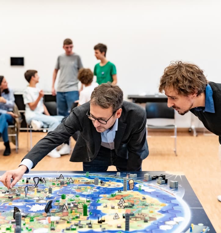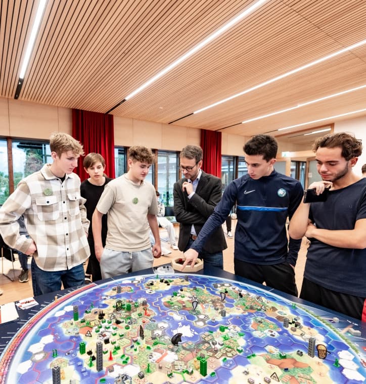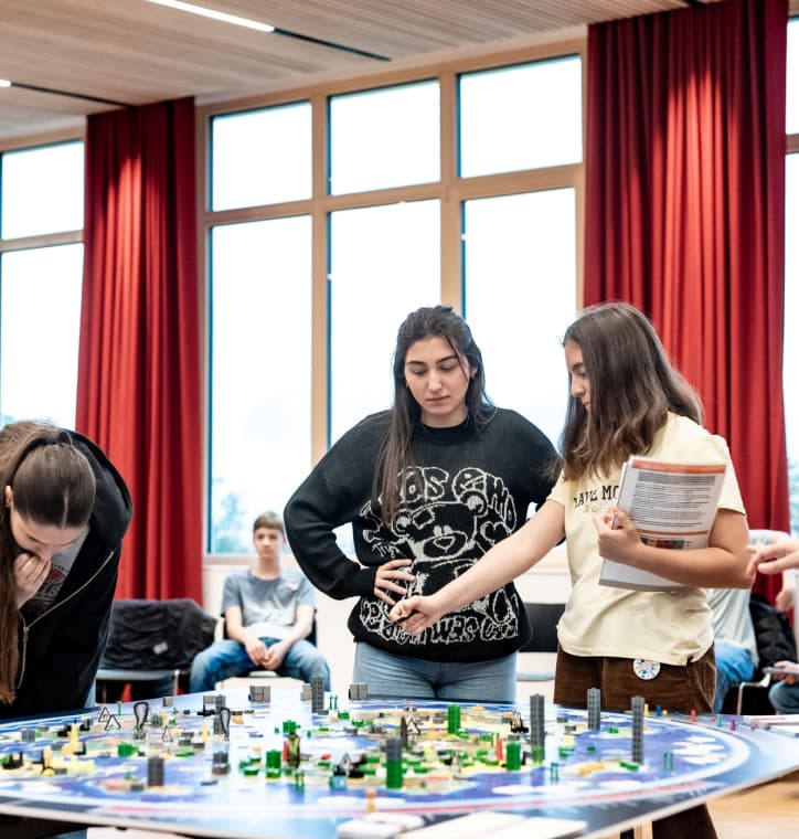 Als Regierungschef, Wirtschaftsministerin, Geschäftsführer oder Lobbyistin eines globalen Konzerns treiben die Schüler:innen Rohstoffabbau, Waren- und Kapitalhandel, investieren in die Forschung oder schließen Verträge ab. Dabei treffen unterschiedlichste Eigeninteressen aufeinander. All das geschieht unter den Augen der Zivilgesellschaft, welche durch Streiks, Infokampagnen und Petitionen die Aufmerksam auf dringliche Themen lenken kann. Eine weitere Akteurin auf der Weltbühne ist die Unabhängige internationale Organisation, die zwischen den Regierungen vermitteln und Friedensverträge oder Klimaschutzgesetze initiieren kann.